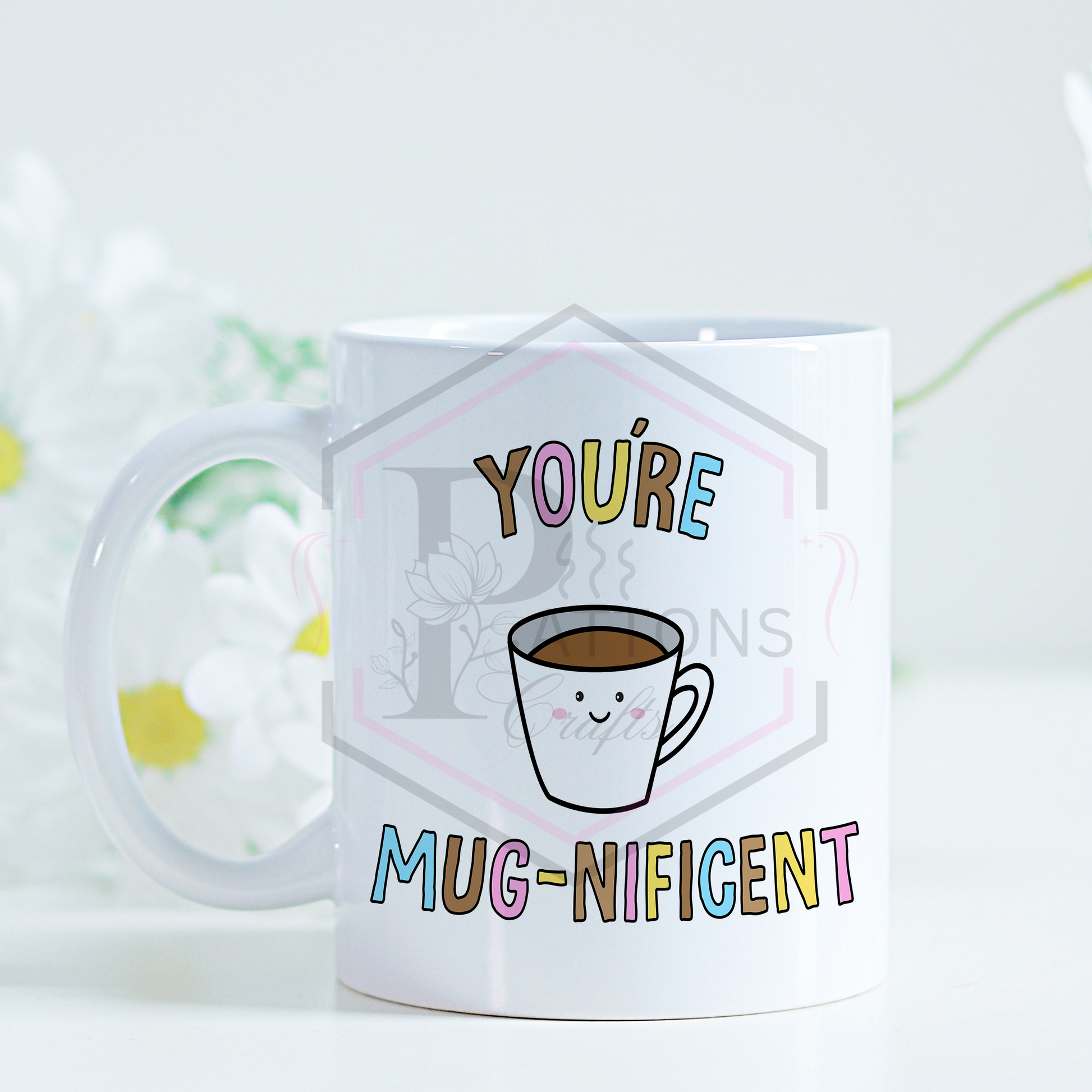 This adorable 11oz white ceramic mug features the playful pun “You’re Mug-nificent” the perfect pick-me-up for anyone who deserves a little compliment with their coffee.