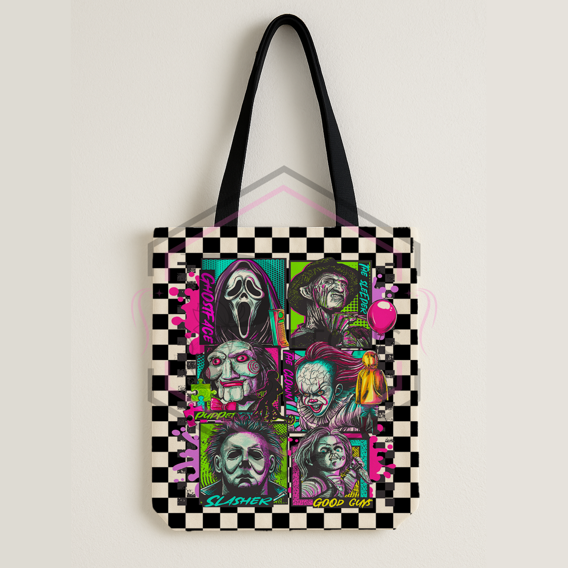 where edgy art meets everyday function. Each tote features the "funky killers Collection" designs splashed across a bold black-and-white checkerboard front, bringing a pop of funky colours and creativity to your style.