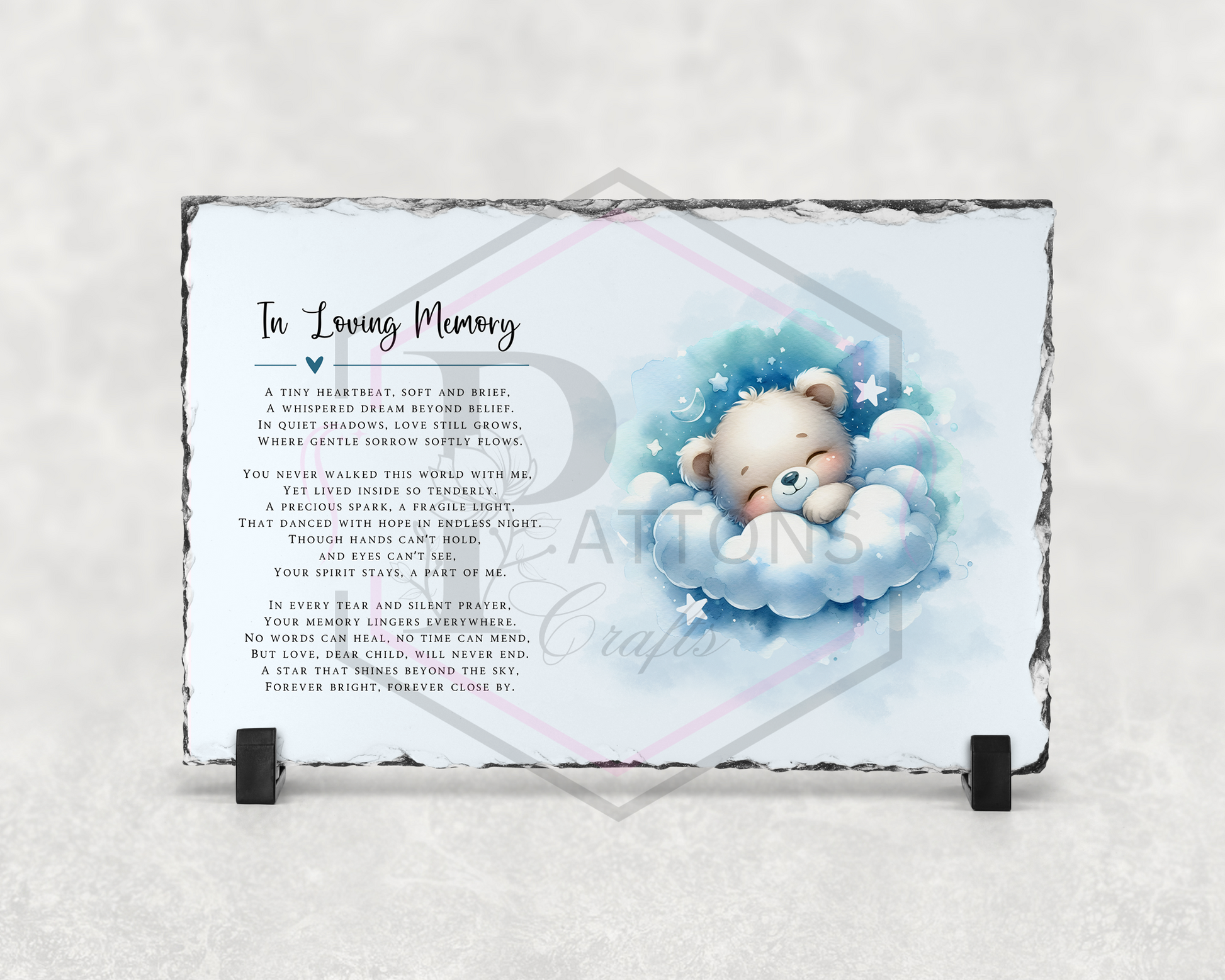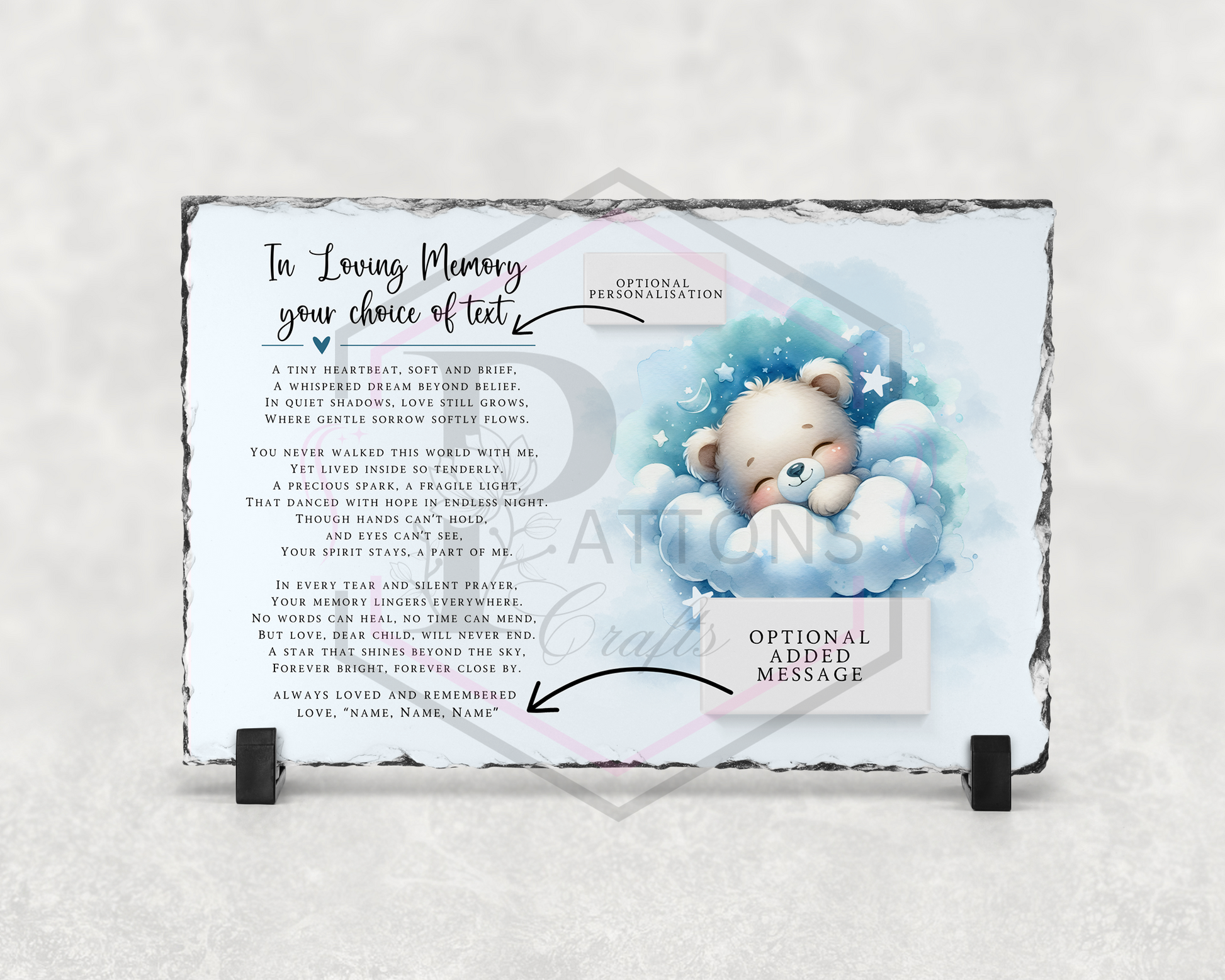 Honour your precious little one with this heartfelt baby loss memorial slate. Featuring a sweet sleeping teddy bear resting on a moon and stars, this 20x30cm plaque is a beautiful tribute to a child lost too soon.