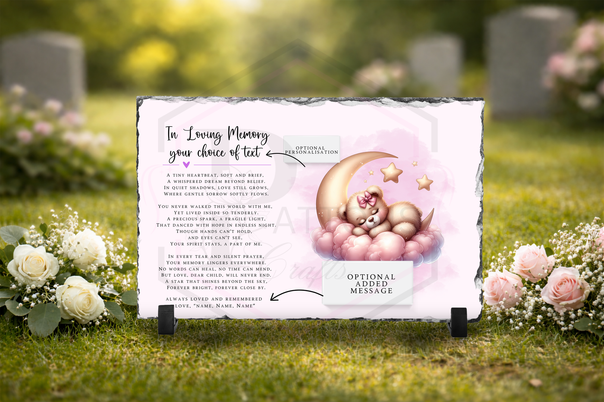 Honour your precious little one with this heartfelt baby loss memorial slate. Featuring a sweet sleeping teddy bear resting on a moon and stars, this 20x30cm plaque is a beautiful tribute to a child lost too soon.