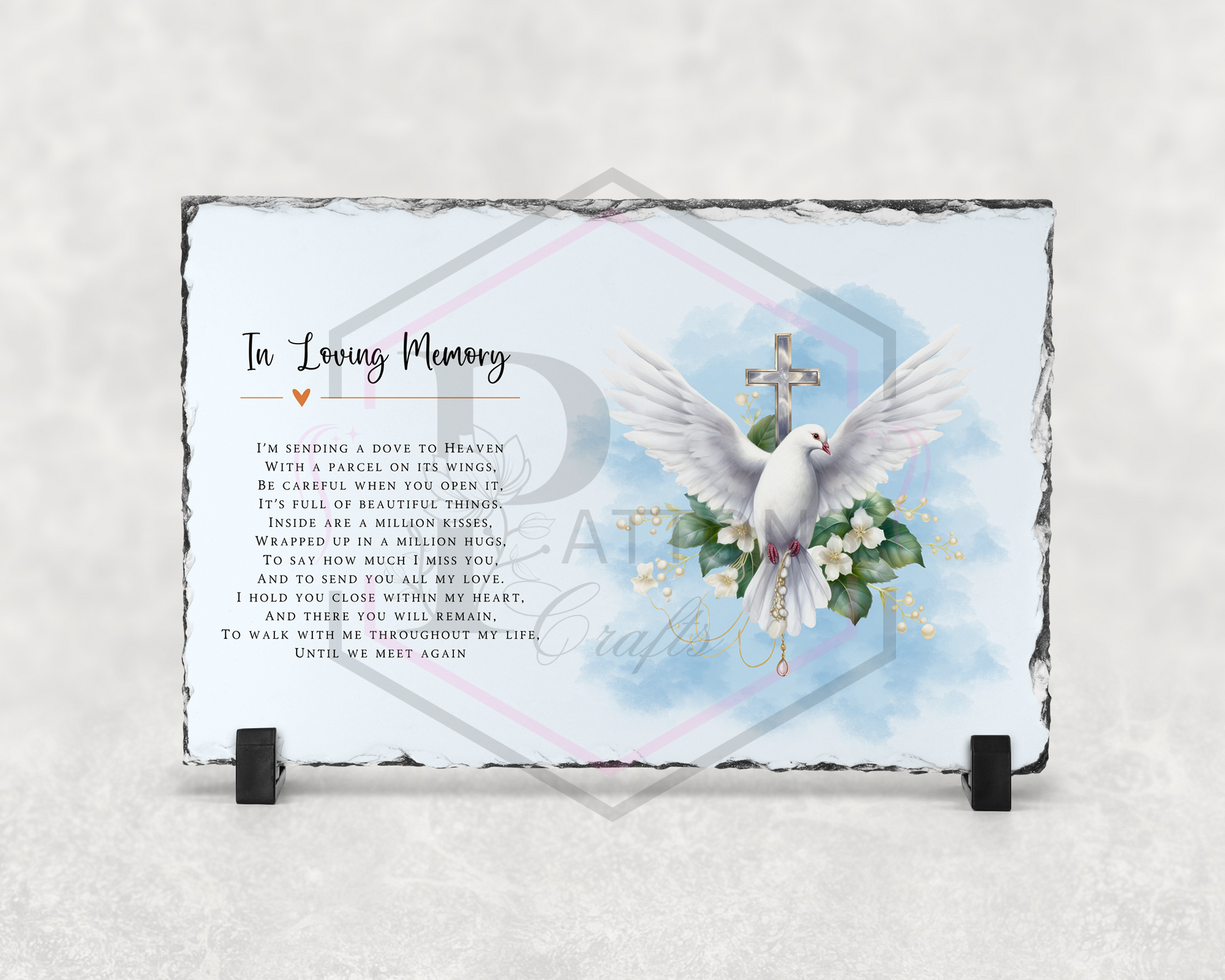 Create a lasting tribute with this personalized dove memorial slate plaque, thoughtfully designed to honour your loved one’s memory. Made from durable natural rock slate and measuring 20x30cm, this rectangular plaque features a peaceful dove design — a timeless symbol of love, hope, and everlasting peace.