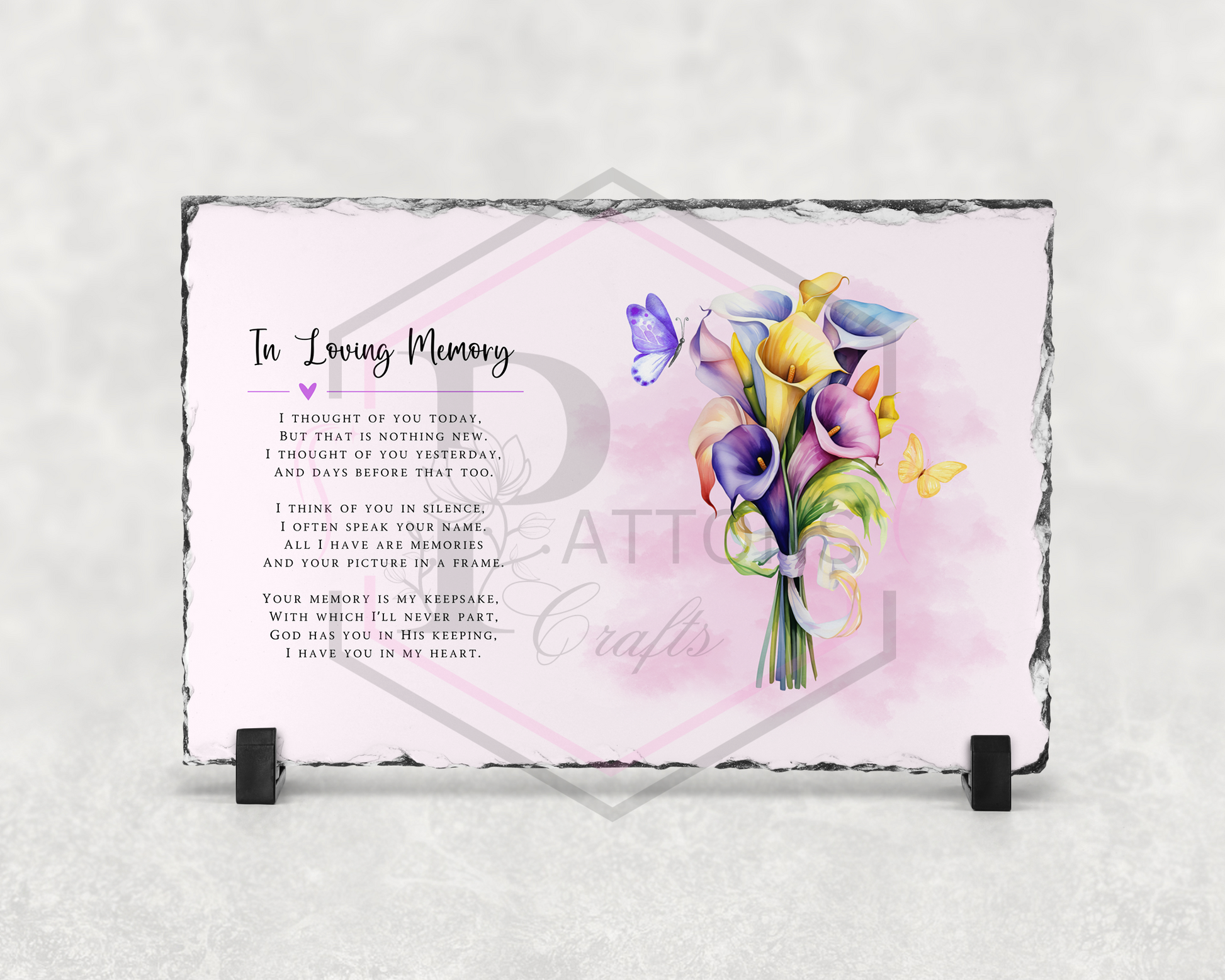 Honour your loved one’s memory with this beautiful pink memorial slate, featuring delicate coloured lilies and a heartfelt ‘In Loving Memory’ verse. This 20x30cm slate plaque is perfect as a grave marker, garden memorial, or thoughtful remembrance gift.