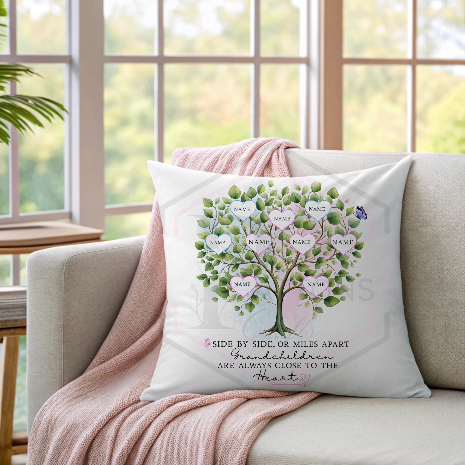 This meaningful design shows a charming family tree with each grandchild's name placed inside a heart on the tree. Hearts can be personalised with a blue or pink outline to represent boys and girls, creating a truly special keepsake that reflects your family perfectly.